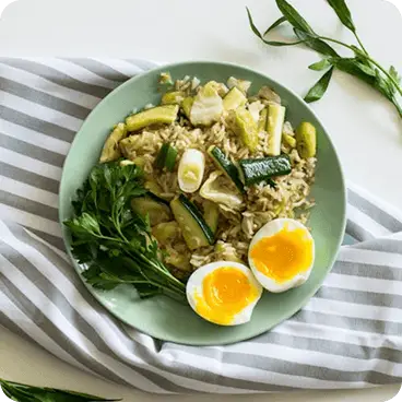 Rice, Zucchini, Olive oil, Garlic, Onion, Salt, Pepper, Fresh herbs